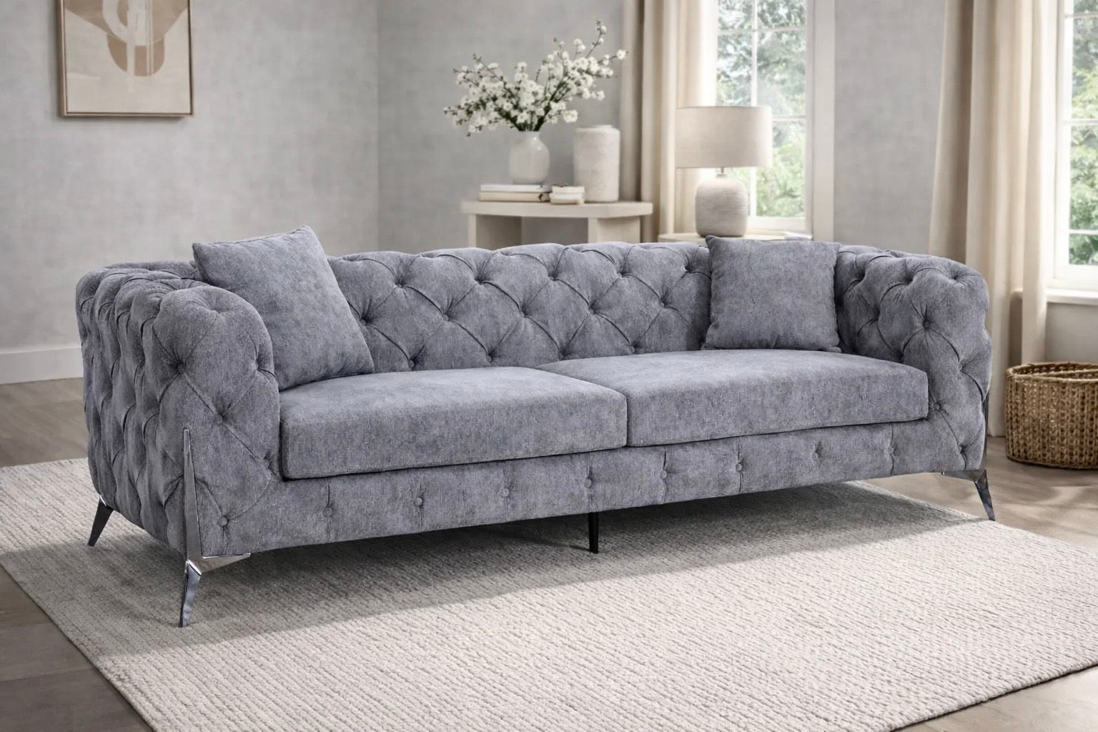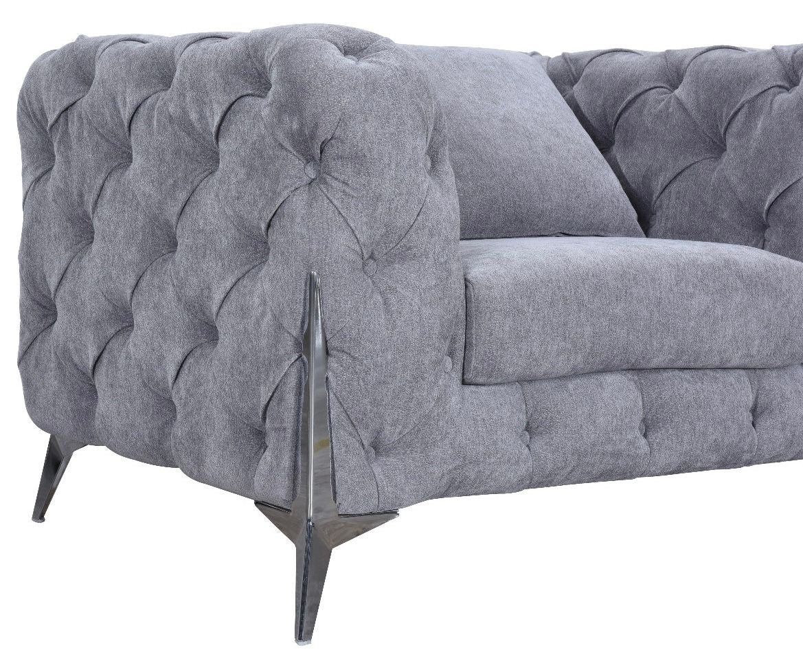 The Paris Sofa brings timeless elegance to any living space with its sophisticated Chesterfield design. Upholstered in quality grey fabric, this collection offers flexible seating arrangements with 3-seater, 2-seater, and 1-seater options to suit your room layout. Distinctive deep button detailing and rolled arms define the classic silhouette, whilst polished chrome accent legs add a contemporary edge. Mix and match pieces to create your ideal configuration, or select individual units for versatile placement throughout your home. Durable construction ensures lasting comfort and style.